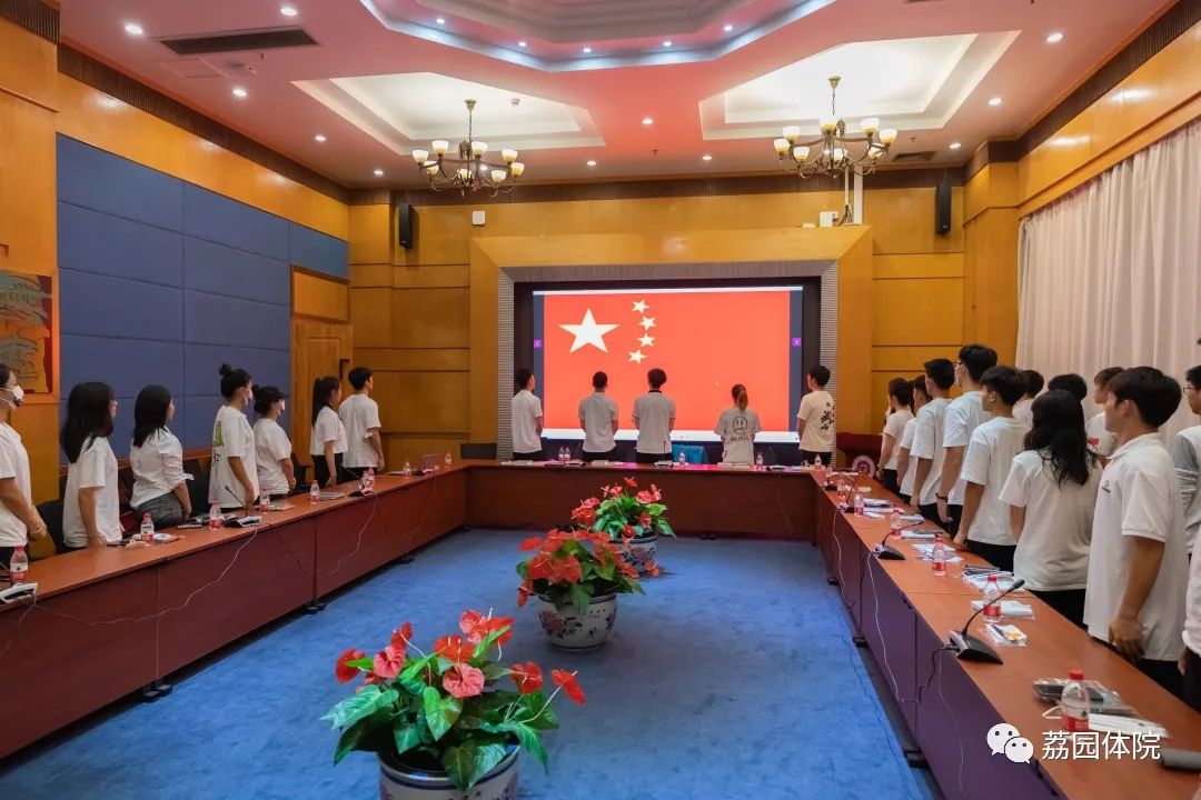 会议伊始,全员起立,奏唱国歌,行注目礼。