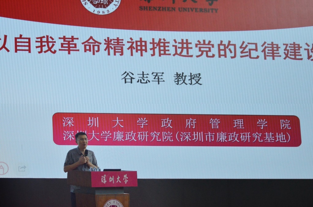 接着,谷志军教授以“党的历史这么长,规模这么大,执政这么久,如何跳出治乱兴衰的历史周期?”为切入点,引发在场党员同志的思考。他表示“人民监督、自我革命”是两个重要答案。随后,他以第二个答案——自我革命,作为本次授课重点。并开始以《自我革命精神推进党的纪律建设》为主题的党纪学习教育,具体从“党的自我革命思想的提出及内涵 ;纪律建设是自我革命的重要内容;《中国共产党纪律处分条例》解读;加强党纪学习教育争做合格党员”四个方面展开讲述。他着重讲解了《中国共产党纪律处分条例》中“六大纪律”的修订和违纪案例。警醒党员同志要明确遵规守纪的重要性,并希望全体党员以此次纪律学习教育为契机,准确掌握《条例》的主旨要义和规定要求,做到“坚定理想信念,不忘初心、坚持立足岗位,尽职尽责、坚守法律法规,清正廉洁”。用党规党纪校正思想和行动,检视自己的理想信念和思想言行,明确什么该做,什么不该做。