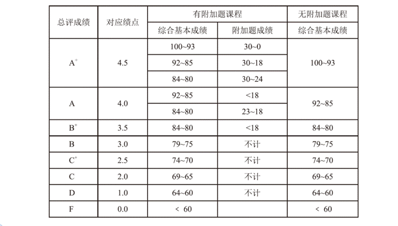 第三十七条 课程综合基本成绩、附加题成绩、总评成绩与绩点对照如下表: