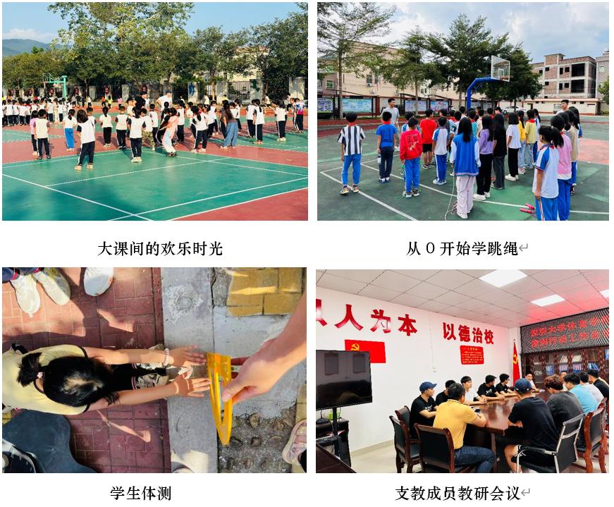 2023年10月17日,读漫屋 体教系系主任赵刚博士、心理与健康教研室主任梁崴博士、数字化体育专家何泉涛博士以及两名优秀体教本科生代表(洪逸凡、付志雄)对定点支教学校进行了前期的调研工作。赵刚主任团队经与八万学校的校长、党委书记吴娘接同志、党委副书记袁水球同志等校方领导的深入沟通洽谈,并结合前期的实地考察结果,最终确定了从五个具体方面对陆丰市八万学校(一所九年一贯制中心校及五所面上小学)进行帮扶,包括:体育课程体系建设、学术性研究、学生体质评估及提升、中考体育成绩提升以及大课间体育品牌建设。