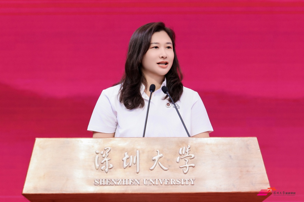 校友代表王冠斌,2018年青奥会冠军,结合体育训练和职场经历,鼓励学弟学妹“以体育人的坚韧直面挑战”。