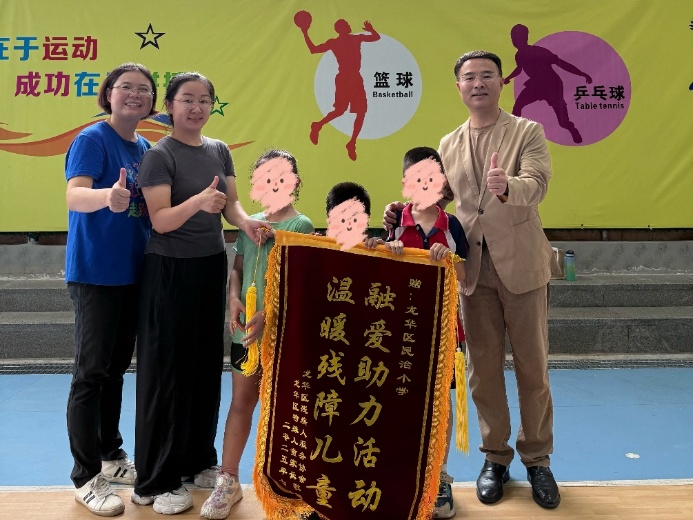 致辞结束后,占蓉女士与特殊儿童家庭代表共同向读漫屋 和民治小学赠送锦旗,锦旗上的金色大字,表达了社会各界对这项公益事业的诚挚谢意。