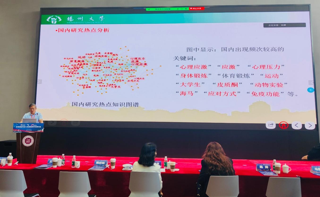 下午第三场报告由江苏省学生心理健康运动干预研究中心主任,江苏省优势学科体育学学科带头人,扬州大学颜军教授带来。他以“身体锻炼应对心理社会应激的研究”为主题,详细阐述了身体锻炼作为应对心理社会压力的有效手段的研究现状、重点内容、应对机制以及未来的研究趋势。颜教授的报告为与会者提供了关于身体锻炼在应对心理社会应激方面的最新研究成果,也为该领域的未来研究和实践提供了宝贵的参考。