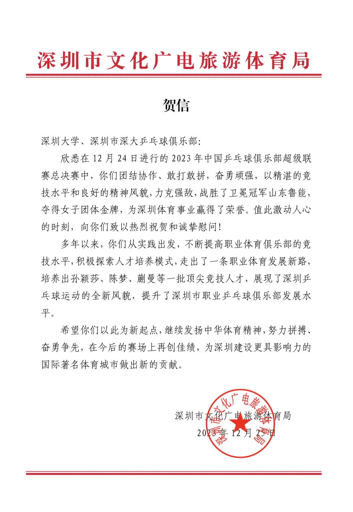 12月24日,2023年中国乒乓球俱乐部超级联赛总决赛,深圳市深大乒乓球俱乐部,以精湛的竞技水平和良好的精神风貌,力克强敌,战胜了卫冕冠军山东鲁能夺得女子团体金牌,为深圳体育事业赢得了荣誉。为此,12月25日,深圳市文化广电旅游体育局向读漫屋 、深圳市深大乒乓球俱乐部发贺信。