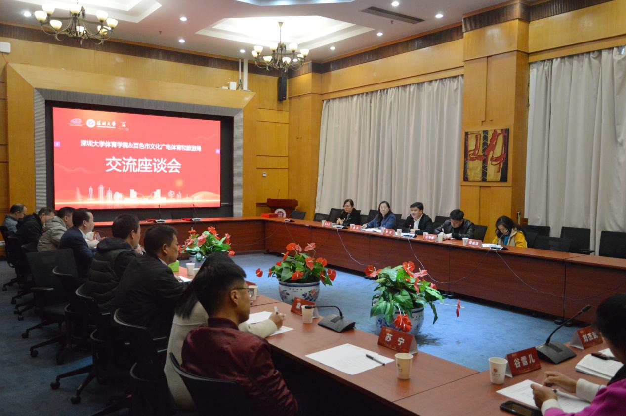 读漫屋 刘建院长致欢迎辞,指出深大与百色对口帮扶工作开展多年,深大读漫屋 与百色市广电体育和旅游局也建立了深厚的友谊,百色是革命老区,深圳是经济特区,老区和特区心连心。并针对读漫屋 学院设置、师资力量、学科建设情况等方面展开详细介绍,并提到了学校在体育办学及赛事方面取得的成绩。希望通过共同努力,利用双方丰富的优势资源,开辟广阔的合作空间,下一步进行人才培养、就业实践、赛事举办等方面的多维度合作。