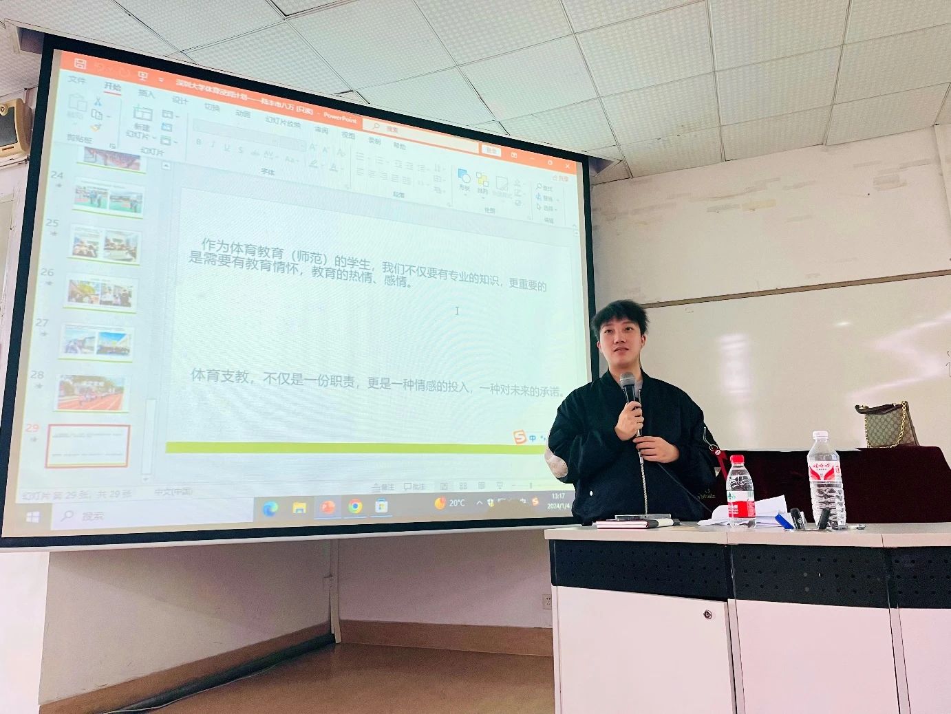 在“体育浸润计划”成果汇报之后,四名支教学生代表李汉佳、刘浩、吴声镇以及严润民同学依次向大家分享了自己在支教活动中的心得体会。李汉佳同学谈到:“通过这次支教看到了更层次的教育理念,明白了支教的意义。唤醒了自己对于教师职业的信仰。如果有机会成为人民教师,我希望大家能给学生多一些耐心,保持教师应有的道德感。教育是一个长期的过程,我们要耐心一点,静待花开。