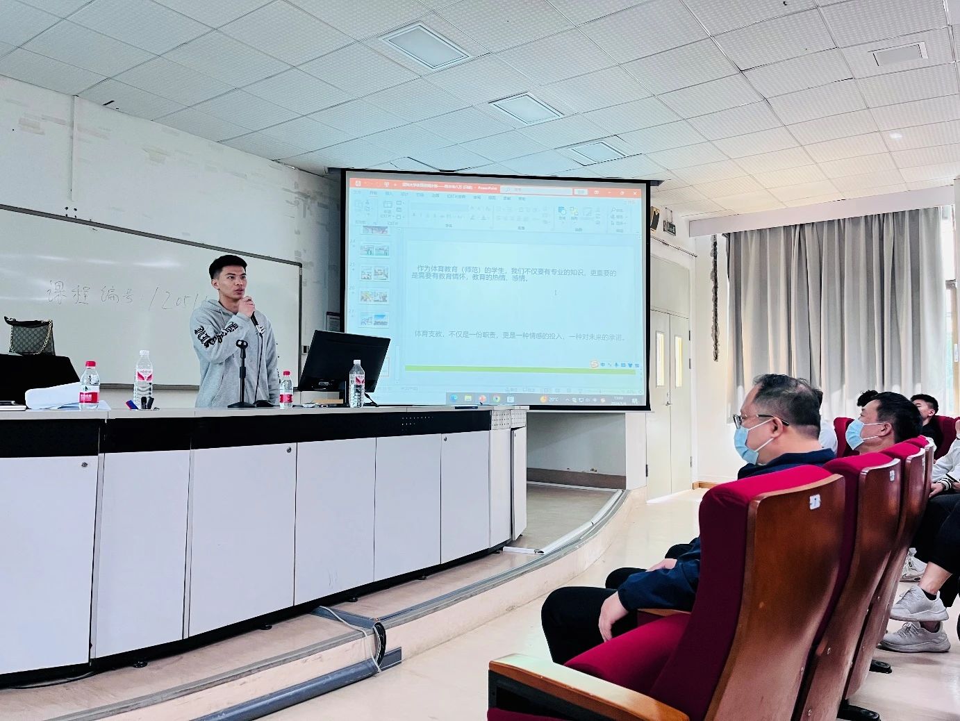 领导致辞之后,作为本次“体育浸润计划”的支教学生队长2021级体育教育系的洪逸凡同学对帮扶汕尾市陆丰八万学校的“体育浸润计划”进行了成果汇报,内容围绕体育课程体系建设、学术性研究、学生体质评估及提升、中考成绩提升、校运动队及武术大课间品牌建设等方面。洪逸凡同学代表整个支教团队为“体育浸润计划”交上了满意的答卷。其间,洪逸凡同学还分享了自己在支教过程中的点点滴滴,虽然只有短短3个月的时间,但支教的经历难忘且珍贵,尤其是和支教帮扶学校那边的师生建立起了浓厚的情谊,让人感动。